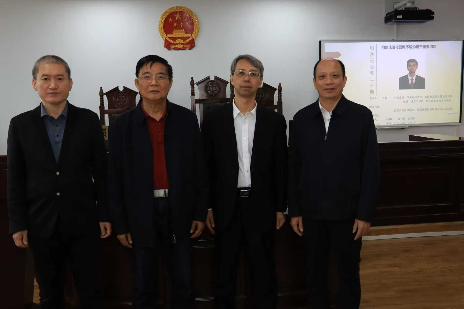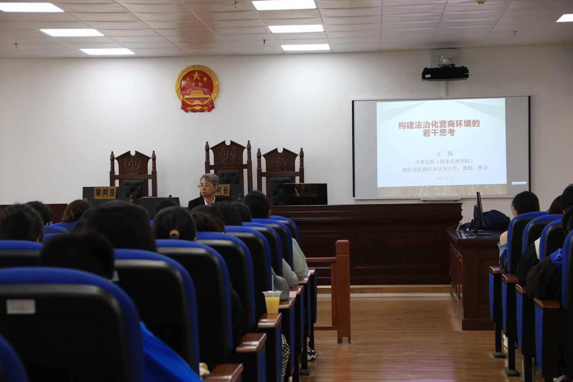 近日,中共中央党校(国家行政学院)政法部民商经济法室主任、博士研究生导师在五合校区理综楼模拟法庭,开展了题为《构建法治化营商环境的若干重要问题》的学术报告,这是我院“明法论坛”举办的第二十期学术活动。学术报告由卢明威副院长主持,法律系教师、研究生和本科生100余人参加了报告会。