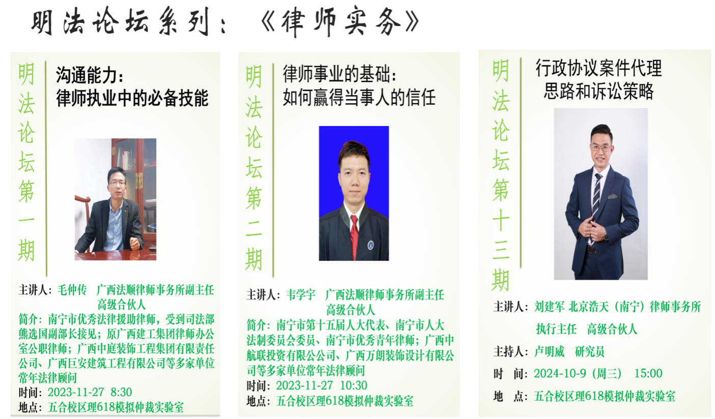 本学位授权点从广西区高级人民法院、广西区人民检察院等法院、检察院系统,广西锐嘉弘律师事务所、广西法顺律师事务所、广西佳宾律师事务所、广西涌流律师事务所等法律实务部门聘请法院、检察官、律师等校外导师25人。与南宁市司法局、来宾市中级人民法院、崇左市人民检察院等多家司法行政系统、法院、检察院以及广西华商律师事务所、广西苇航律师事务所等多家律师事务所签订实习实践教育基地,系南宁市人民政府立法联系点。学位授权点《审判实务》《检察实务》《律师实务》等实务课程均由资深法官、检察官、律师承任授课导师,其中律师实务系列课程“明法论坛”已完成19期授课。